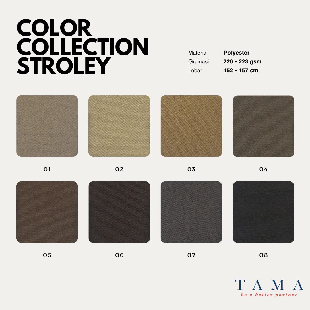 Perkenalkan salah satu color series dari produk kami. Stroley, salah satu best seller product kami ini diciptakan dari 100% polyester dengan karakteristik mechanical stretch. Dengan sepenuh hati, kami menciptakan kain yang sempurna dan berkualitas tinggi bagi berbagai kebutuhan bisnis fashion. Stroley memiliki daya tahan yang baik terhadap suhu tinggi saat pencucian dan pengeringan, warna yang tidak mudah luntur, serta tahan terhadap sobek dan gesekan.